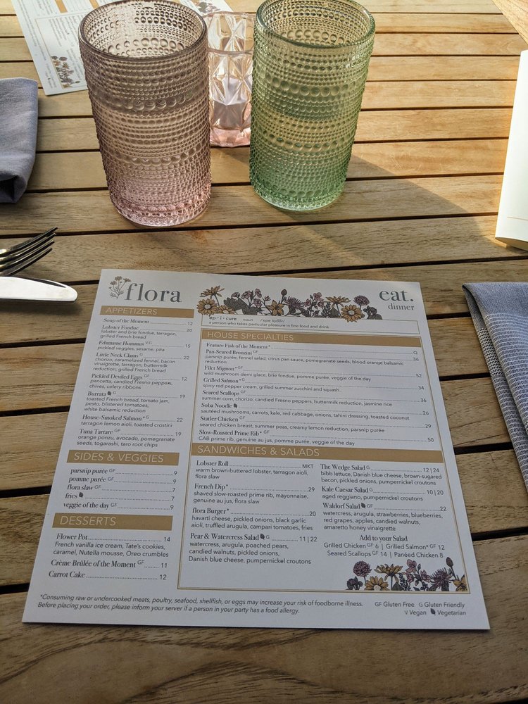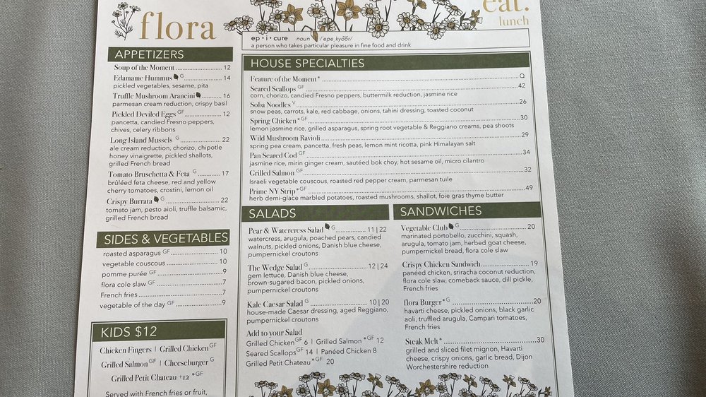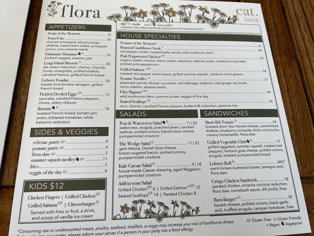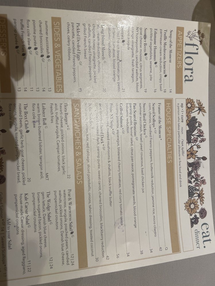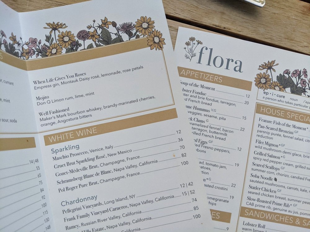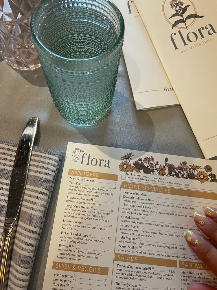 "flora" in Westhampton Beach is a trendy cocktail bar offering New American cuisine. With a cozy and romantic ambiance, it's a great spot for dinner or drinks. Customers rave about the prompt service, friendly staff, and delicious food, though portion sizes may leave some wanting more. The upscale menu features vegan options and dishes like scallops, duck, beet tartare, hummus, and burrata. The bar is fully stocked, offering unique cocktails and a full menu for those looking to unwind. The chic decor with plants and flowers adds to the charming atmosphere. If you're in the Hamptons and looking for a memorable dining experience, flora is a top choice with its exceptional service, beautiful decor, and mouth-watering dishes.
